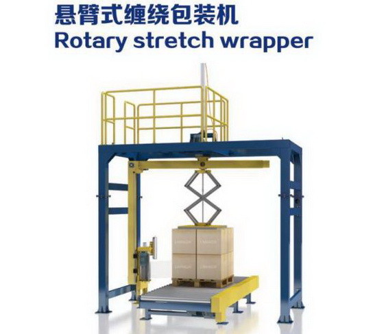 A bandeja da carga passa através do transporte da posição de espera do transporte. Quando a vaga da posição da máquina de enrolamento é detectada, os bens param, e o levantamento com macaco automático pneumático (opcional) é adotado. A máquina de enrolamento carrega automaticamente o filme e envolve o filme superior. O processo de enrolamento é realizado de acordo com o procedimento ajustado até o enrolamento é terminado e o filme é quebrado automaticamente. Os bens são transportados então à estação de dois transportes de rolo por sua vez, empilhadeira de espera, empacotando terminaram.