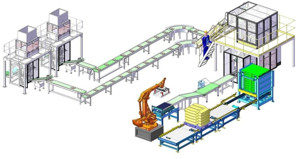 C. Geralmente, uma linha da embalagem & palletizing inclui: Armário elétrico, máquina de costura, transporte da costura, máquina do impulso do saco, transporte de Reshapen, detector de metais, verificador de peso, saco Rejecter, transporte da impressora a jato de tinta, impressora a jato de tinta, compartimento de pálete, transporte Palletizing, robô, máquina de envolvimento, transporte palletizing Finished.