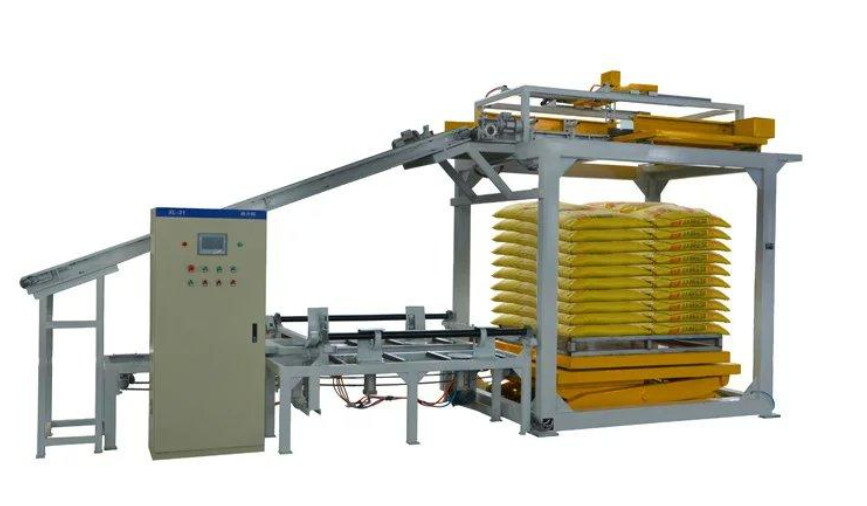 O palletizer empilha materiais contidos (em umas caixas, teceu sacos, tambores, etc.) ou artigos automaticamente empacotados/unpackaged da regular-forma na pálete (de madeira) de acordo com um determinado arranjo. Após ter empilhado diversas camadas, a pálete completa será transportada para fora para uma embalagem mais adicional ou ao armazém por uma empilhadeira. É apropriado para o empilhamento dos sacos e das caixas do arranjo desconcertado no processo deempacotamento.