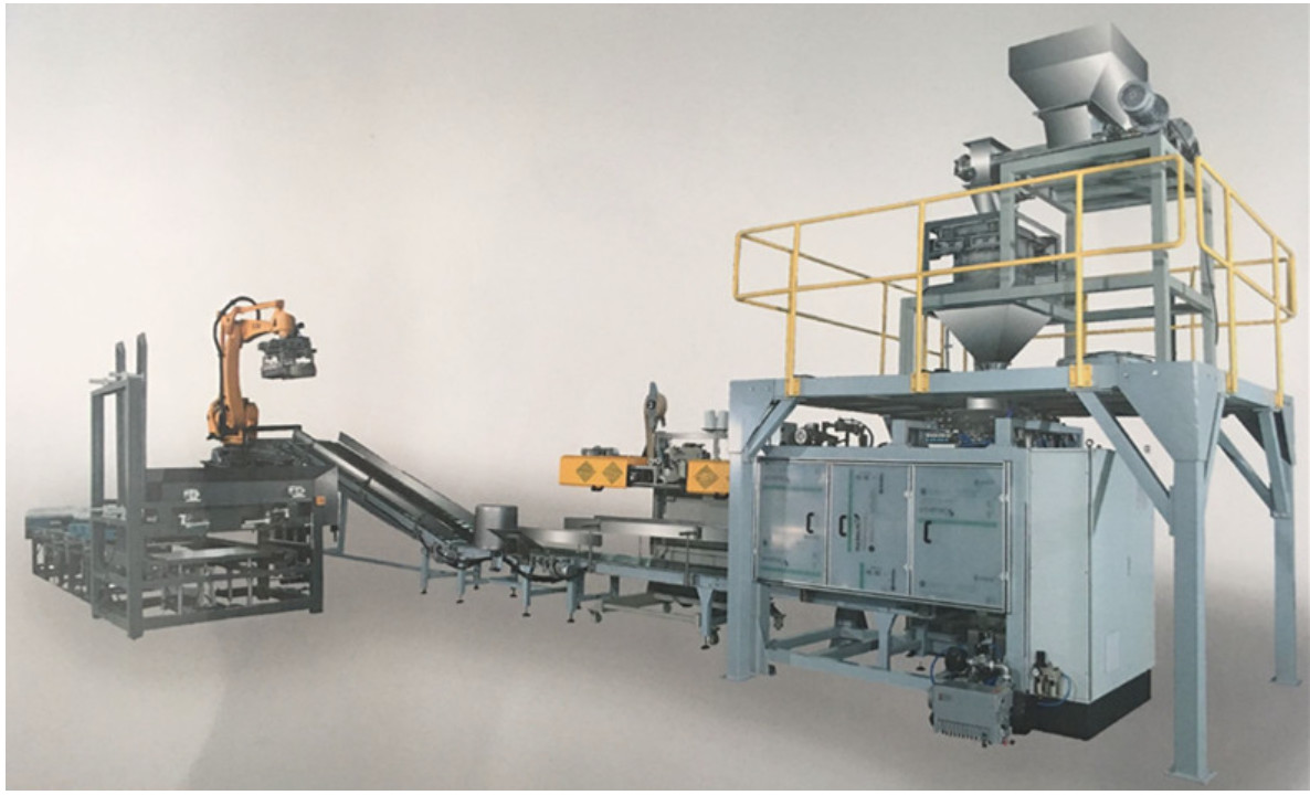 Saco vazio de doação automático - peso automático - enchimento automático - máquina de costura automática - transtorte automático - empilhamento palletizing do robô automático;